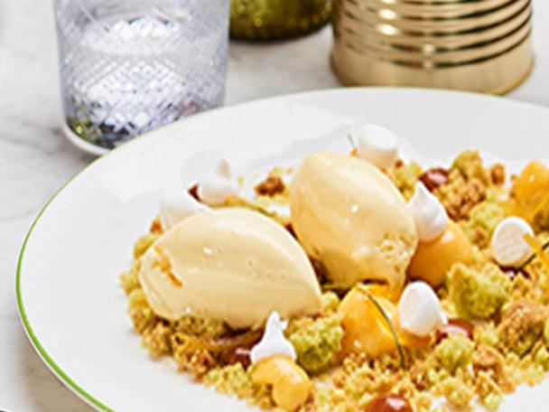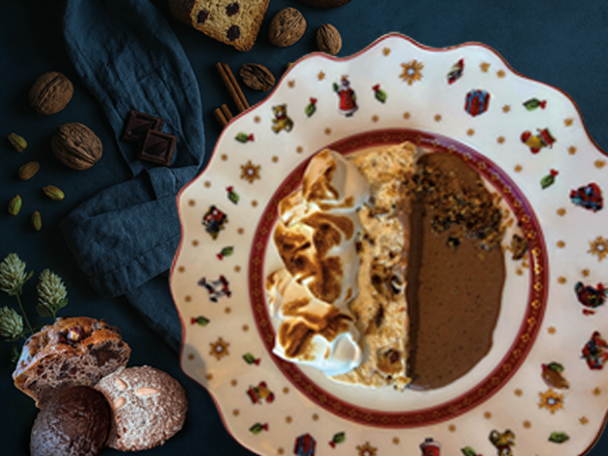 Stollenparfait mit Lebkuchensauce und Schnitzbrot-Crumble