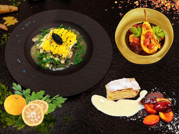 Rotkohlsalat mit gebratener Birne *** Kabeljaufilet unter der Kartoffelkruste mit Petersilienwurzelpüree und Yuzu-Kartoffel-Sud *** Topfenstrudel mit einer leichten Marzipan-Lebkuchen-Soße und Zwetschgenkompott