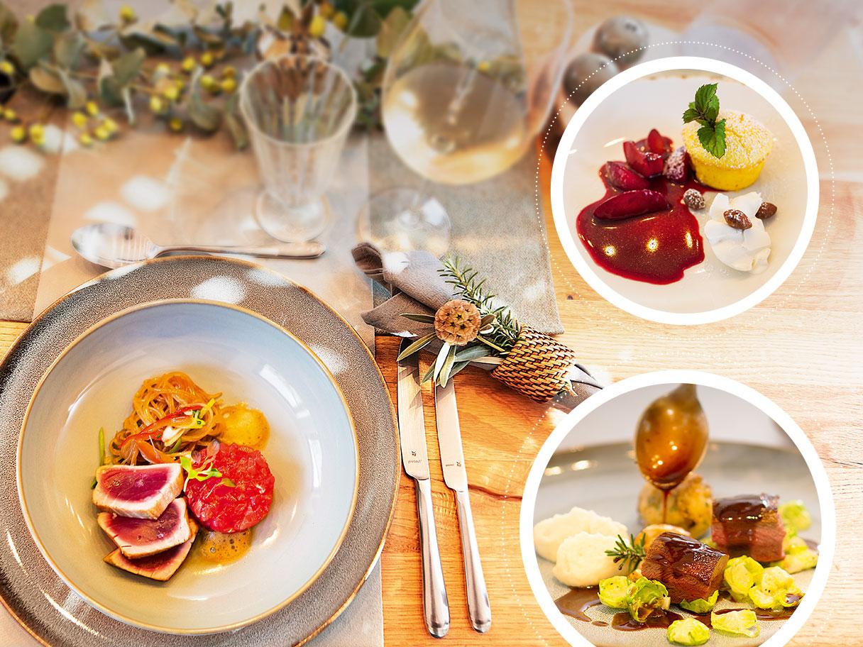 Zweierlei vom Thunfisch an Glasnudelsalat *** Rehrücken mit Blaubeersauce und Pfifferlingknödel *** Quarksoufflé auf Zwetschgenröster und Gebratene-Mandel-Eis